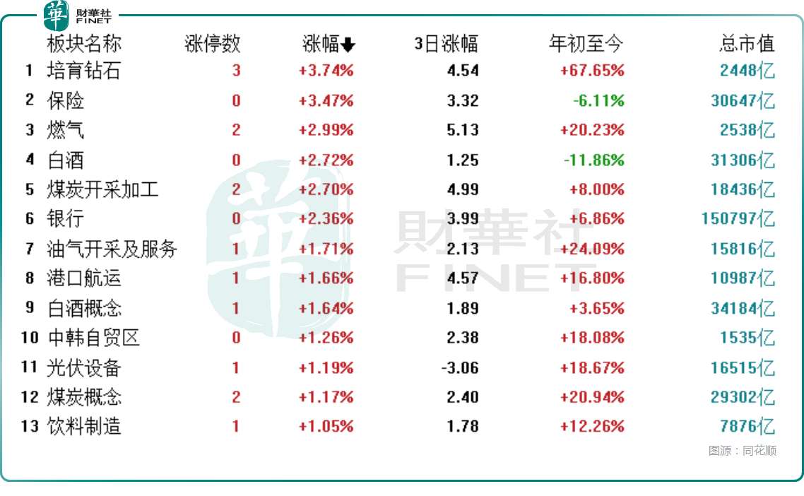 板块方面,能源金属、半导体、光刻机、小金属、PEEK材料、人形机器人等概念跌逾3%,是导致市场下跌的主导力量;而在另一边,培育钻石、保险、白酒、煤炭开采加工、银行、港口航运、光伏设备、饮料制造等前期表现不佳的板块集体逆势上涨。