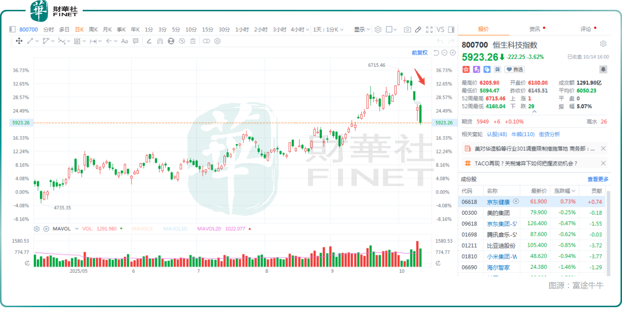 以10月14日的表现为例,在港股市场,恒生指数下挫1.73%,而恒生科技指数大跌了3.62%,在最近7个交易日累跌11.37%,弱势明显。