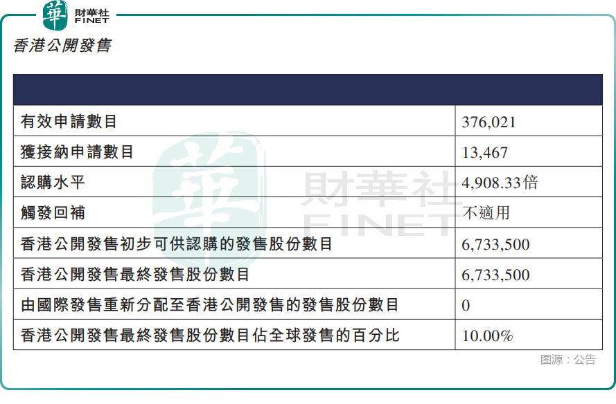 根据公告,香港公开发售方面,轩竹生物获4908.33倍认购,发售股份最终数目为673.35万股股份,占发售股份总数的约10%。总共接获约37.60万份有效申请,受理申请数目1.35万份。