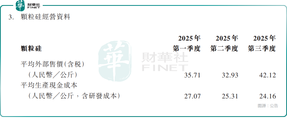 而在2025年第一季度至第三季度,协鑫科技的平均外部售价(含税)分别为35.71元/公斤、32.93元/公斤、42.12元/公斤。