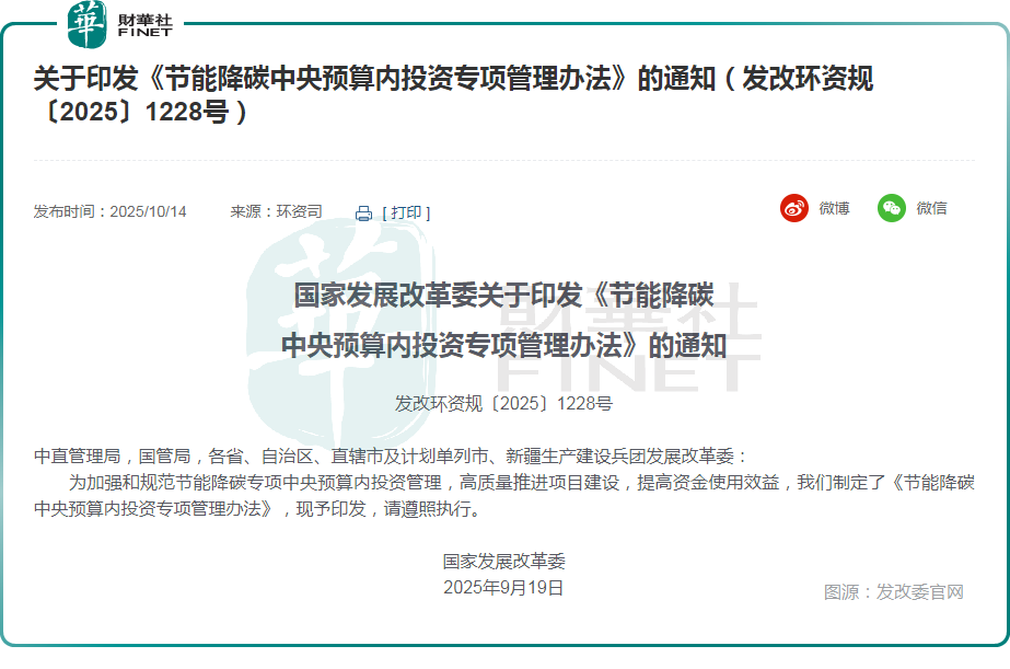 此外,10月14日,国家发展改革委印发《节能降碳中央预算内投资专项管理办法》,聚焦经济社会全面绿色转型目标,统筹中央预算内投资资金,重点支持五大领域项目,涵盖节能降碳、煤炭消费清洁替代、循环经济助力降碳、低碳零碳负碳示范、碳达峰碳中和基础能力建设等关键方向。在项目要求上,明确资金投向前期手续齐全、具备开工条件的计划新开工或在建项目,杜绝用于已完工项目,确保资金精准高效落地。