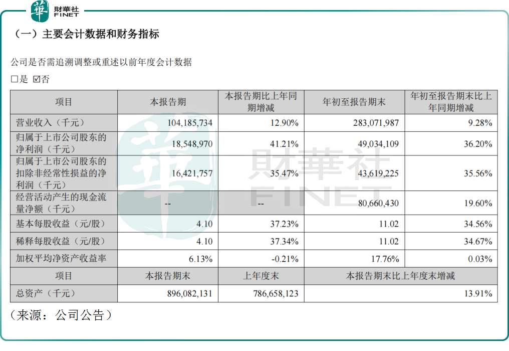 此外,公司第三季度归母净利润185.49亿元,同比大幅增长41.21%;折算下来,公司Q3日赚2亿多,妥妥的“赚钱机器”。第三季度公司扣非归母净利润164.22亿元,亦同比增长35.47%。