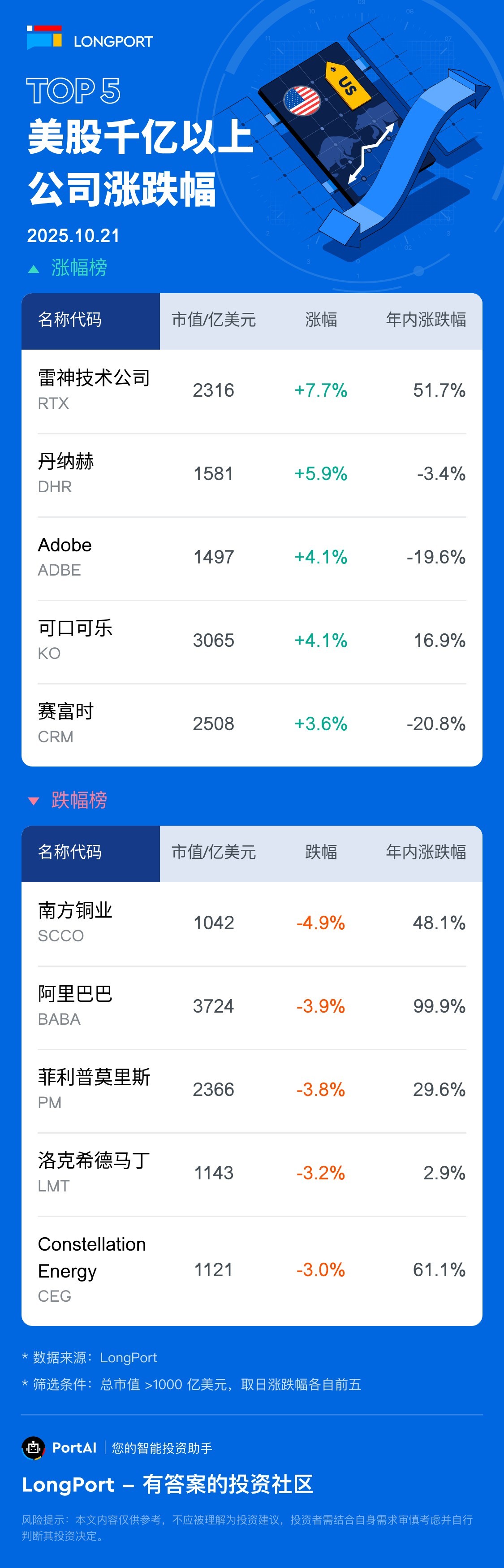 Top 5 美股千亿以上公司涨跌幅(10 月 24 日)