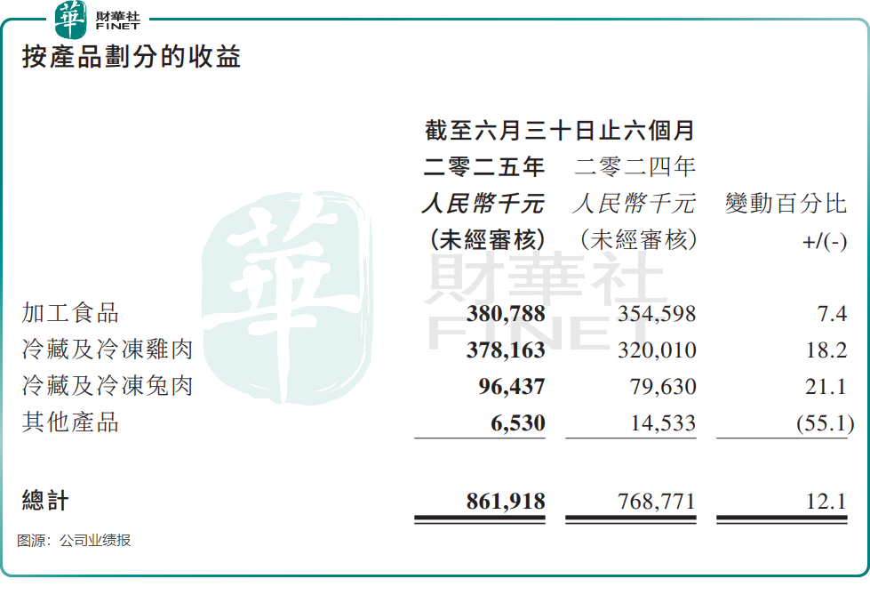转机出现在2025年上半年。随着行业回暖及出口订单增加,康大食品业绩迎来反弹。上半年收入同比增长12.1%至8.62亿元(单位人民币,下同);因产品售价提升,毛利率由去年同期的2.7%提升至5.0%。期内亏损同比大幅收窄93.4%,至153.5万元。