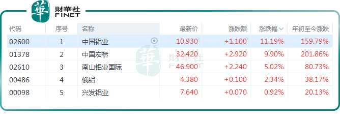 截至收盘,中国铝业(02600.HK)大涨11.19%,中国宏桥(01378.HK)涨9.9%,南山铝业国际(02610.HK)涨5.02%,俄铝(00486.HK)涨2.34%,兴发铝业(00098.HK)跟涨。