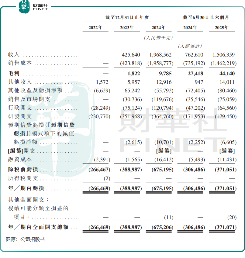 公司2023年开始产生收入,达4.26亿元(单位人民币,下同),2024年激增至19.69亿元。2025年上半年,营收同比接近翻倍,达15.06亿元。