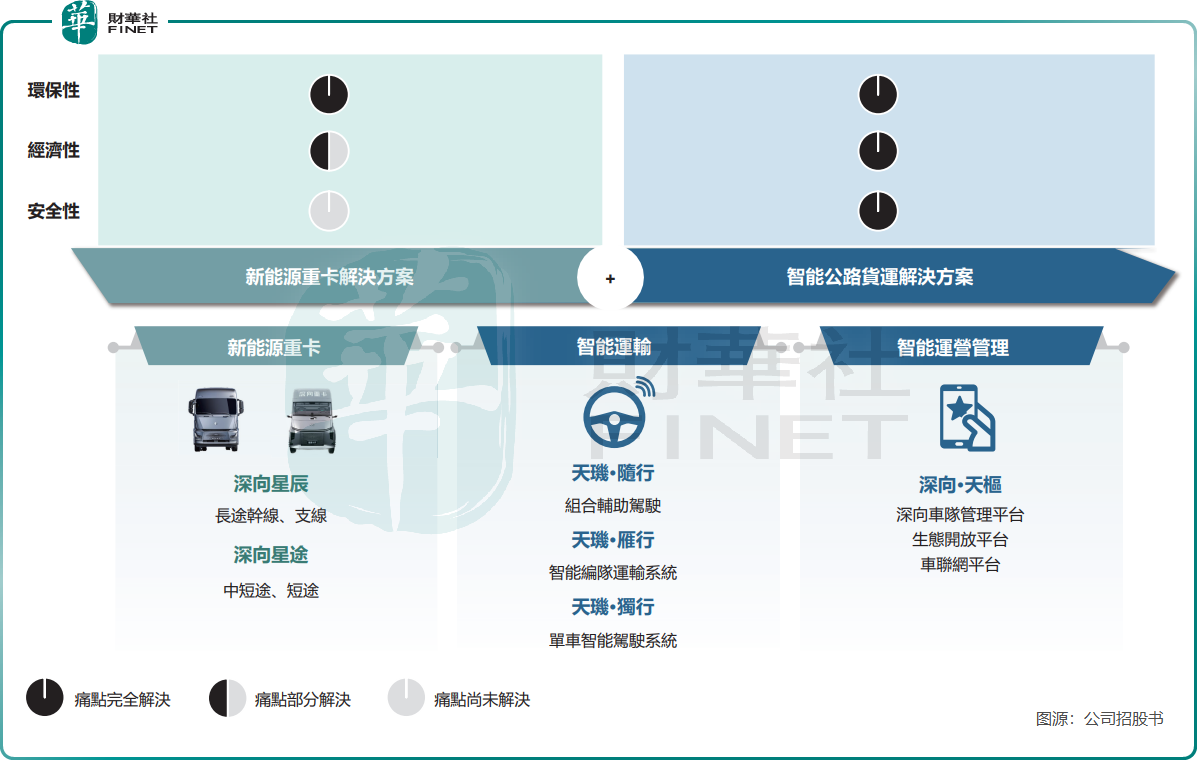 1)新能源重卡解决方案,整合公司的核心技术与系统能力的新能源重卡,公司已实现对新能源重卡核心三电系统(电池系统、电驱及电控制器)的全栈自研,目前已在新款车型中搭载;