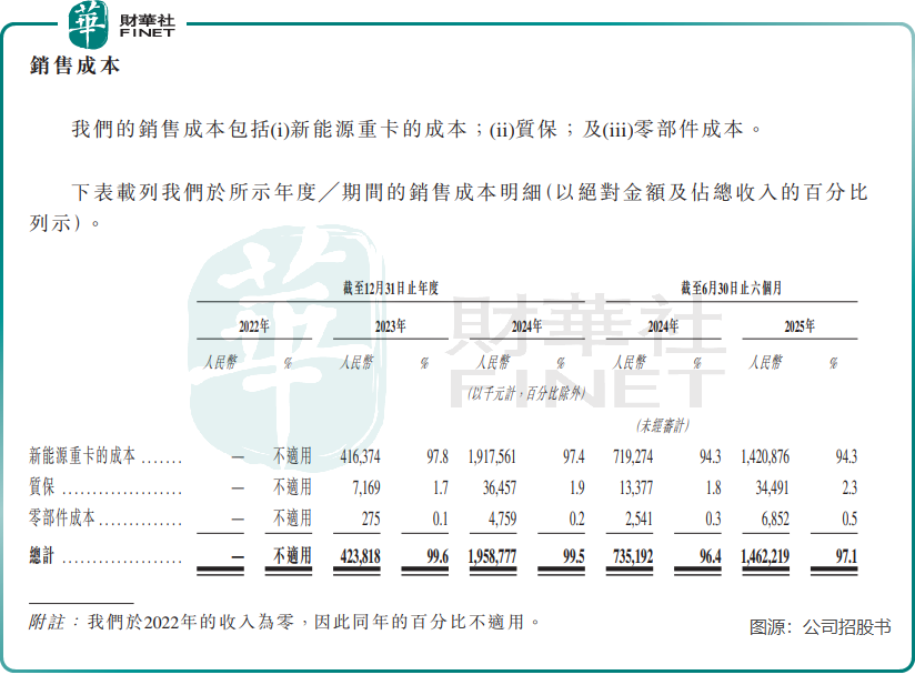 收入结构中,新能源重卡销售占据绝对主导。2025年上半年,该业务收入占比高达99.4%;智能公路货运解决方案尚未产生收入,剩余0.6%来自零部件销售。