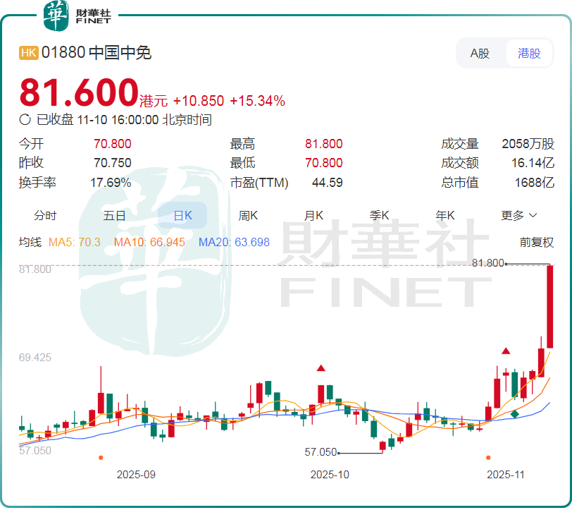 港股方面,中国中免(01880.HK)大涨15.34%,沪上阿姨(02589.HK)涨13.18%,蜜雪集团(02097.HK)、泡泡玛特(09992.HK)、毛戈平(01318.HK)、老铺黄金(06181.HK)、东方甄选(01797.HK)均大涨。
