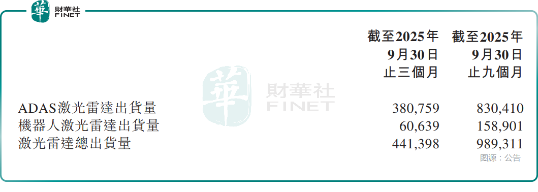 公告披露,第三季度,激光雷达总出货量同比大增228.9%至44.14万台,成为全球首家年产量超百万台的激光雷达企业。其中,ADAS激光雷达出货量38.08万台,同比增长193.1%;机器人激光雷达出货量达6.06万台,同比增长1311.9%,表现尤其出色。