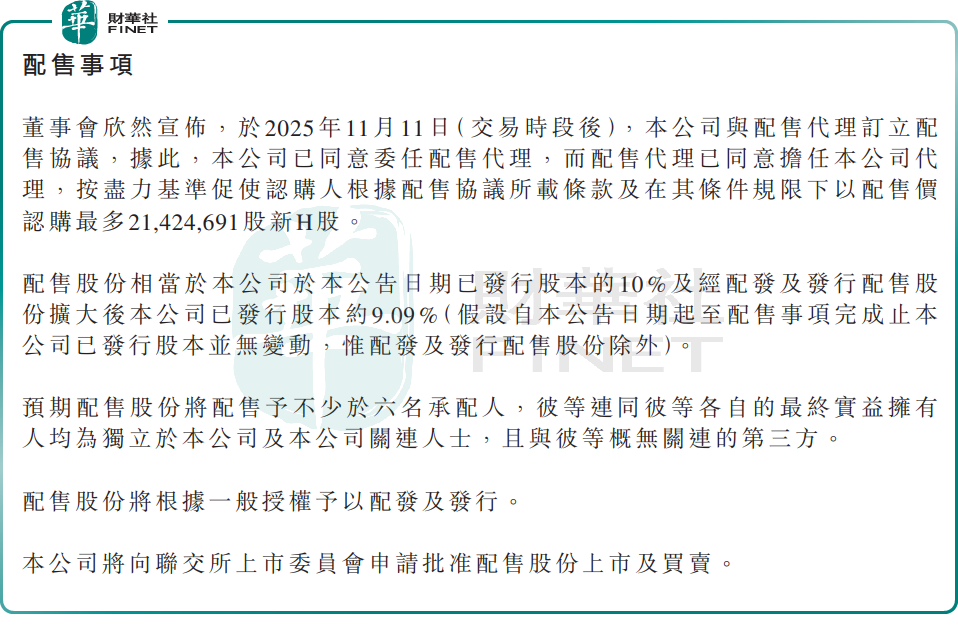 公告显示,江苏宏信于2025年11月11日与配售代理订立配售协议。