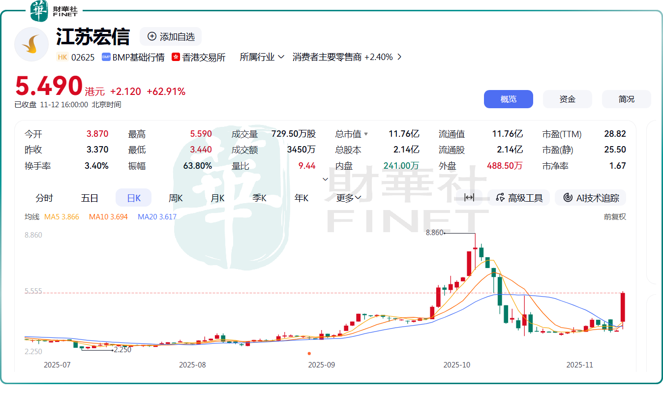 有意思的是,这份常规下被视为短期利空的公告,却点燃了资本市场的热情。11月12日,江苏宏信(02625.HK)股价大幅拉升,截至收盘,涨幅扩大至62.91%,报5.49港元/股。