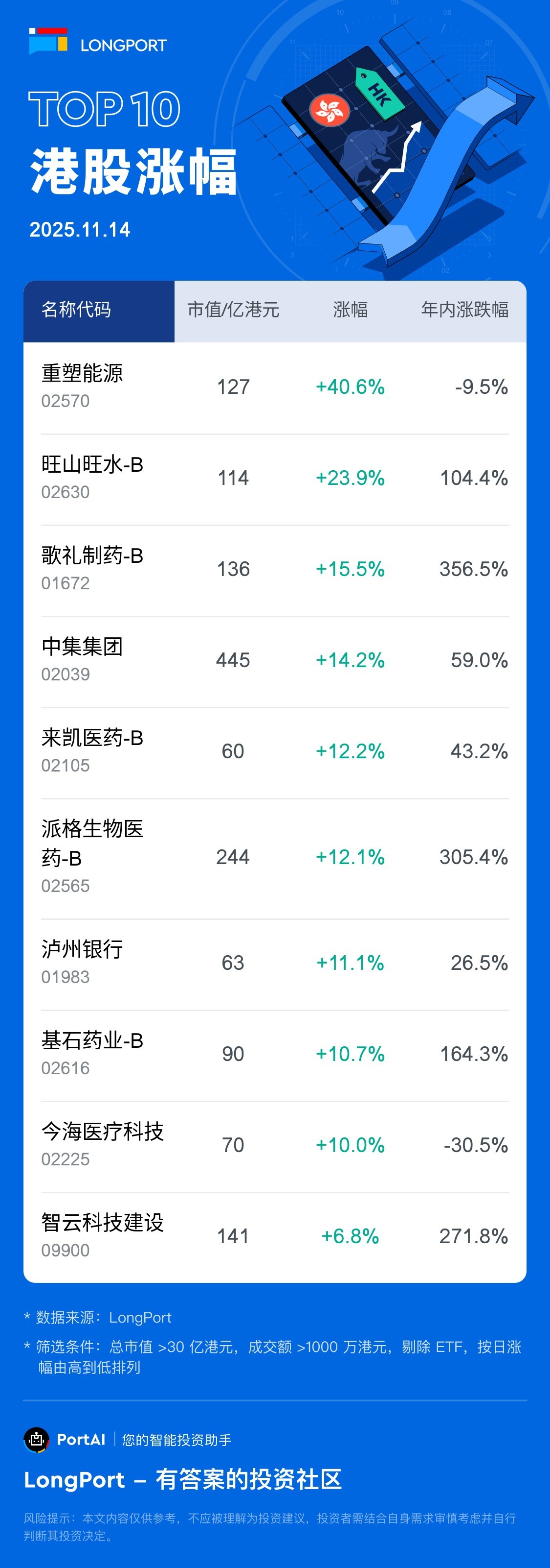 重塑能源 (02570) 涨 40.56%,成交额 8.3 亿港元,年内累计跌 9.5%。