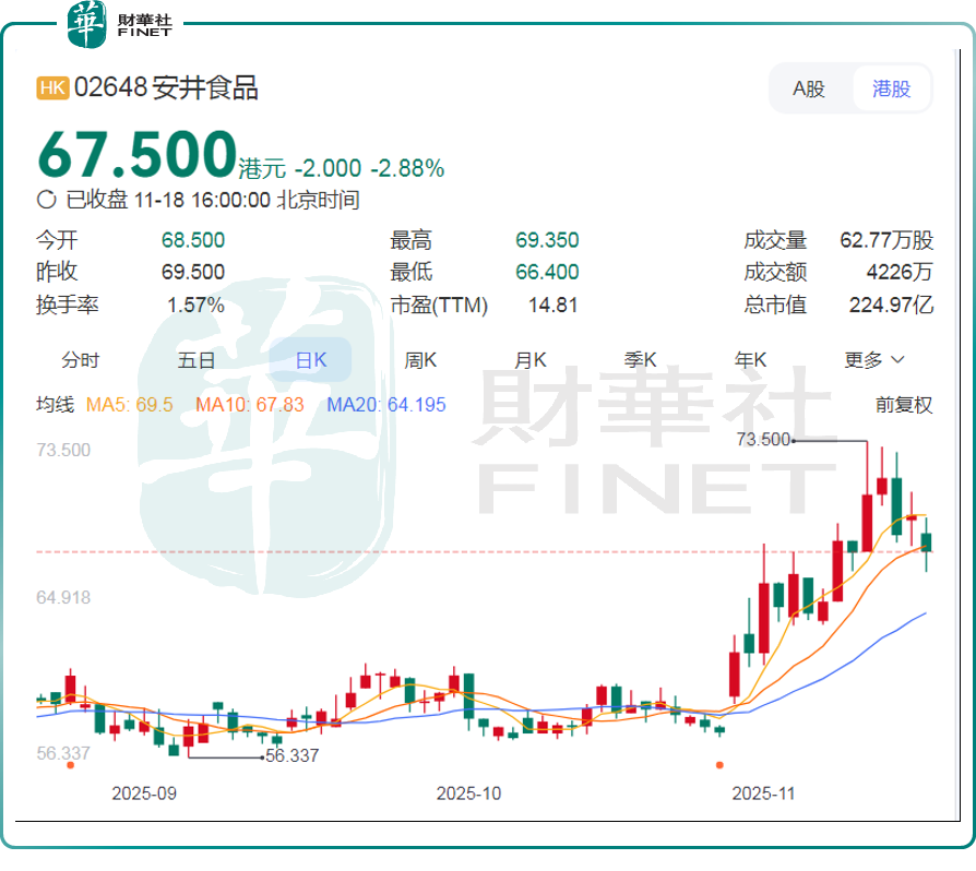 自10月末以来,安井食品迎来一波凌厉的上涨行情,尽管近期股价有所调整,但累计涨幅(包括港、A两市)仍超过15%,这也彰显了市场对这家“冻品一哥”的价值认可。