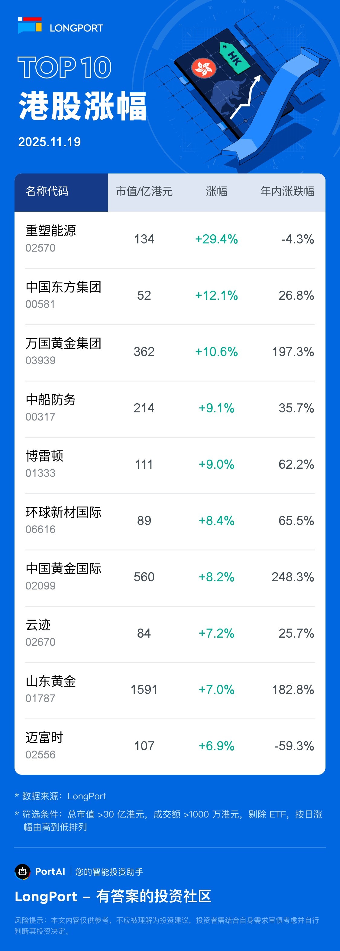 中国东方集团 (00581) 涨 12.1%,成交额 1449.4 万港元,年内累计涨 26.8%。
