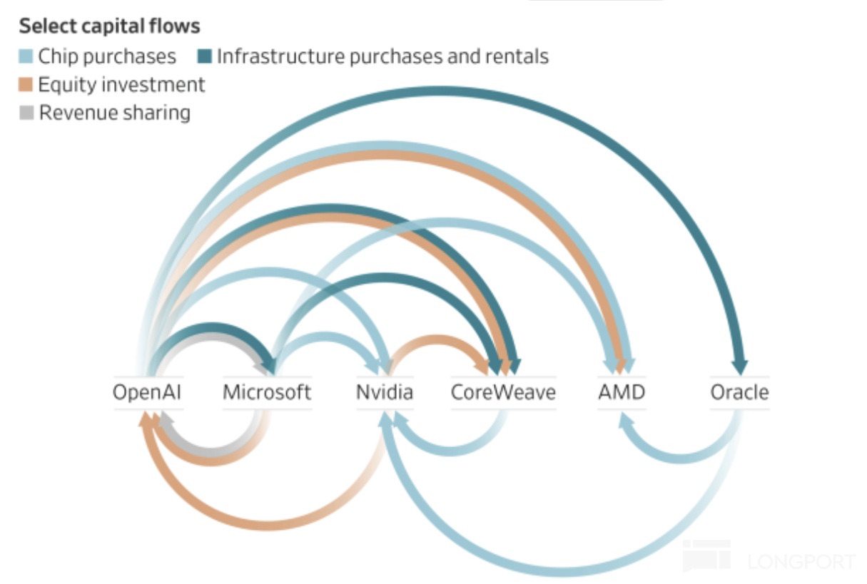 b. 绑定订单:作为一个深受高价算力和供给不足束缚的云服务终端客户,最符合 OpenAI 利益的其实是过剩且便宜的算力,利用上游供应商 FOMO 心理,绑定一切能绑定的产能,用未来的收入预期作为偿付能力,锁定芯片供货。