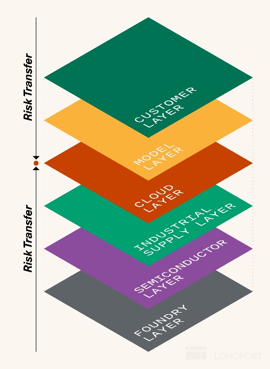 长期承担了资源整合和资金风险(资本开支);如果客户盈利能力不足、场景落地慢、技术迭代突然出现非线性迭代(比如模型变轻,小模型在端侧能完成 AI 大任务,或者本身软件迭代对算力需求大幅减少),可能后续产能利用不足,导致云服务商产能与需求误判,那么它会成为最大下游客户失败的风险承担方,体现不是应用账款收不会,而是数据中心产能浪费。