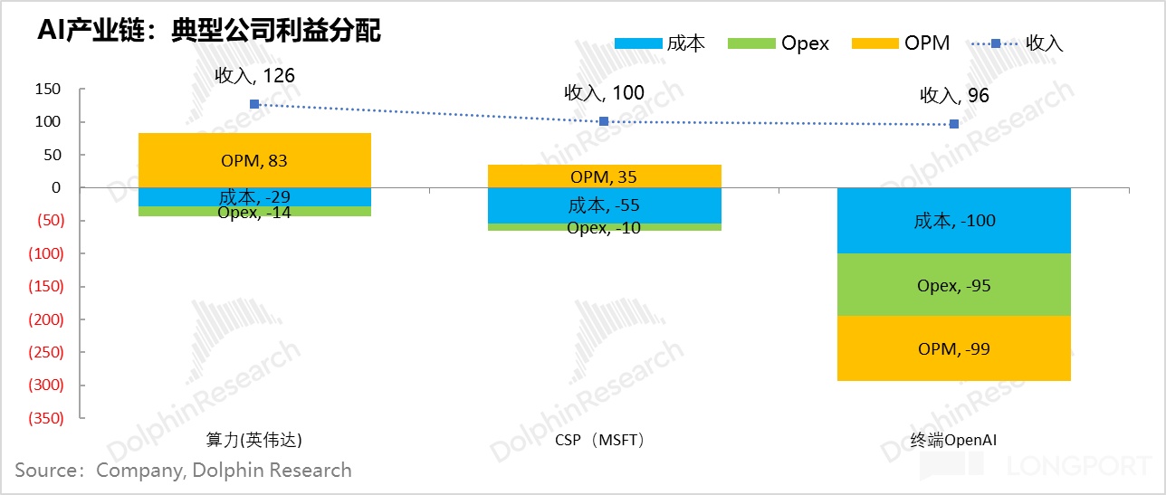 首先云服务商 100 元的 GPU 租赁收入,到 OpenAI 这里,其实就是它为自己的用户提供服务的云服务成本。按媒体披露的 OpenAI 25 年上半年财务状况,100 元的云开支,只能对应公司 96 元的收入,同时算上公司的研发人员开支、营销和管理支出(不含期权激励)——100 元支出,公司基本亏掉了 100 元。