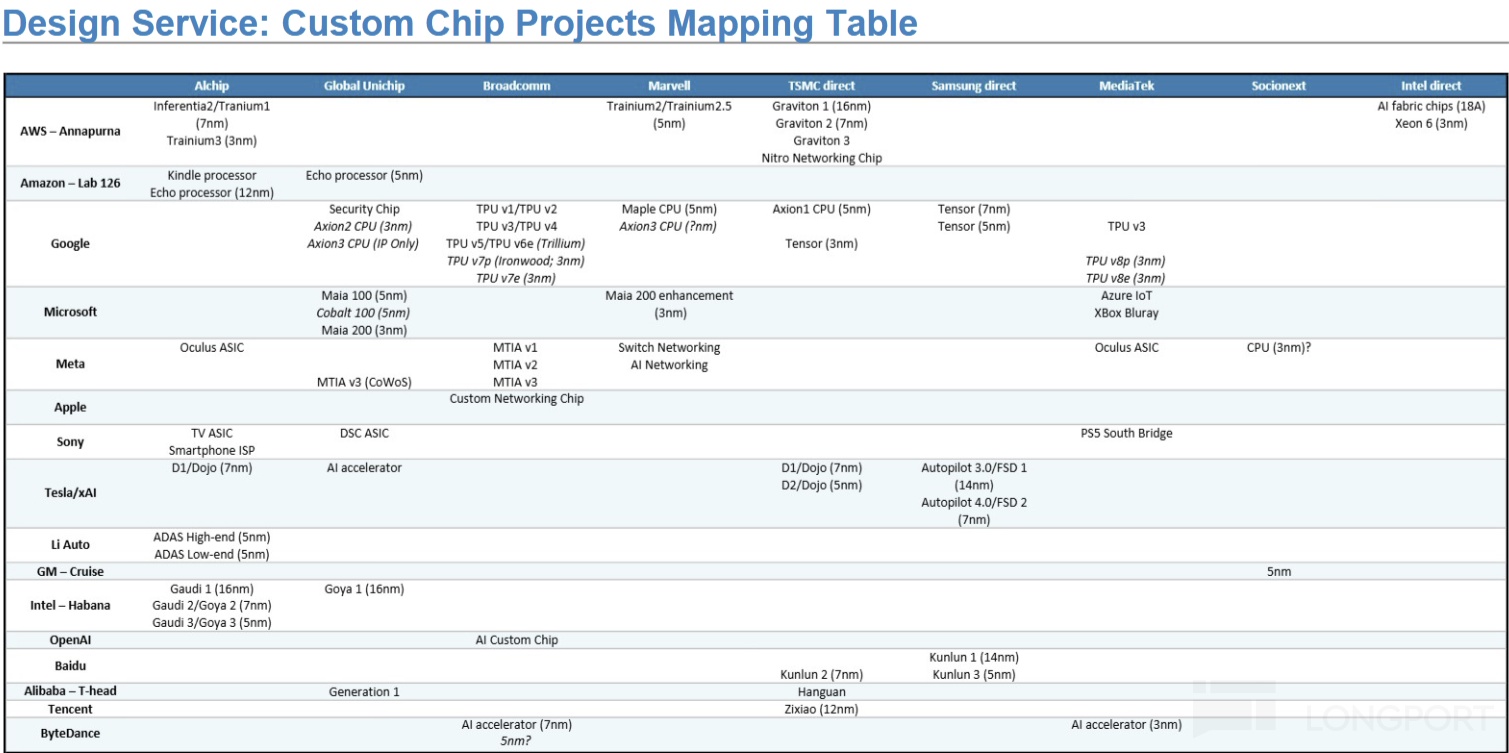 a. 目前 GPU 用量较大的公司基本都开启了自研芯片的努力,这里除了云服务商$谷歌-C(GOOG.US) 、微软和亚马逊$亚马逊(AMZN.US) ,一些单体用量较大的下游客户如 Meta、字节、特斯拉等都在自研 ASIC 芯片。
