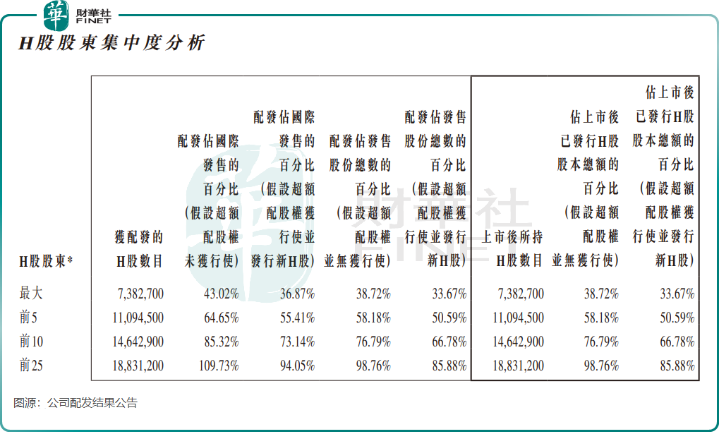 值得关注的是,纳芯微股权集中度较高,这也可能是引发其股价破发的一个重要因素。资料显示,假设超额配售权获行使并发行新H股,公司最大H股股东持股比例将占上市后总股份的33.67%,而前25名H股股东持股比例合计高达85.88%。