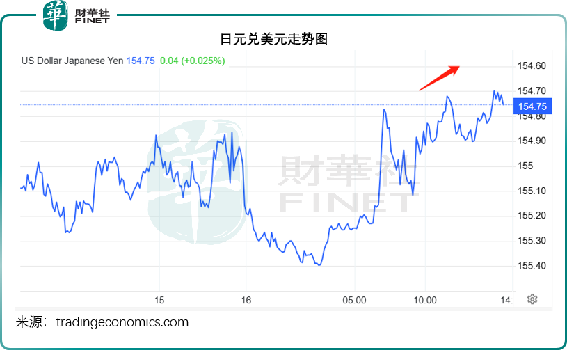 其中美元兑日元的跌幅最大,见下图,日元兑美元汇价走强突破155水平,现报154.75。