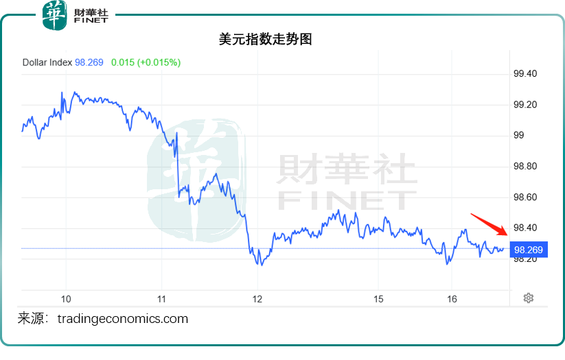 见下图,反映美元兑主要货币的美元指数呈弱,一直维持在98.3以下水平。