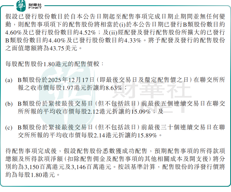 根据公告,商汤与配售代理订立协议,拟以每股 1.8 港元的价格配售 17.5 亿股B类股份,配售价较前一交易日(12 月 17 日)1.97 港元的收盘价折让约 8.63%。此次配售预计筹集总款项约 31.50亿港元,净所得款项约 31.46亿港元。