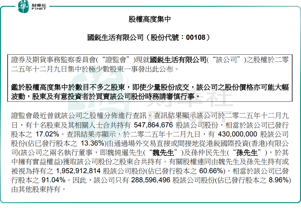 消息面,12月22日,香港证监会一纸公告揭开了国锐生活的“股权高度集中”的隐忧,给市场投资者敲响了风险警钟。