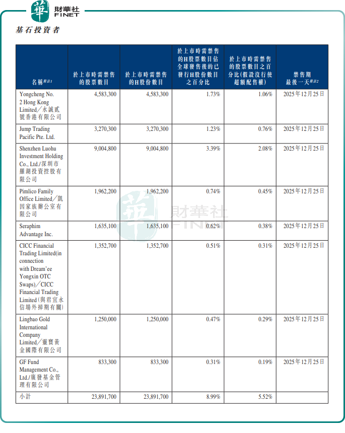 据公司公告,根据相关上市规则及指引,周六福的基石投资者禁售期最后一日为2025年12月25日。