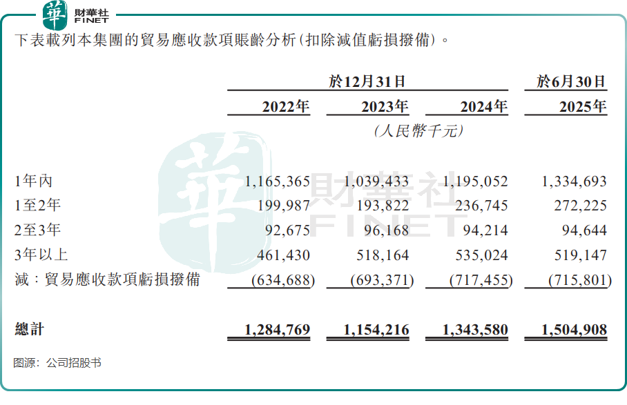 截至2025年6月30日,公司贸易应收款项高达15.05亿元,较2023年末的11.54亿元明显增长。从账龄结构看,3年以上账龄的应收账款占比居高不下,2025年上半年仍有5.19亿元,这部分款项的回收风险极高。于2025年上半年,公司贸易应收款项亏损拨备就高达7.16亿元。