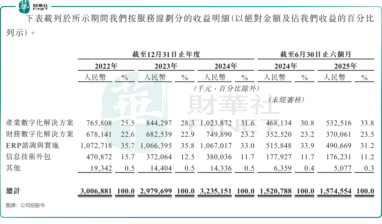 招股书显示,公司四大业务板块分化明显:作为传统核心的ERP咨询与实施业务,正陷入增长停滞,2022-2024年收入近乎零增长,2025年上半年更是同比下降4.88%。核心问题出在两个方面:一是传统ERP市场渗透率已达瓶颈,增长空间见顶;二是国产替代浪潮下,公司长期依赖的Oracle、SAP等海外ERP体系需求减少,而自身在国产ERP实施领域的竞争力还没跟上,直接面临“替代冲击+增长瓶颈”的双重压力。
