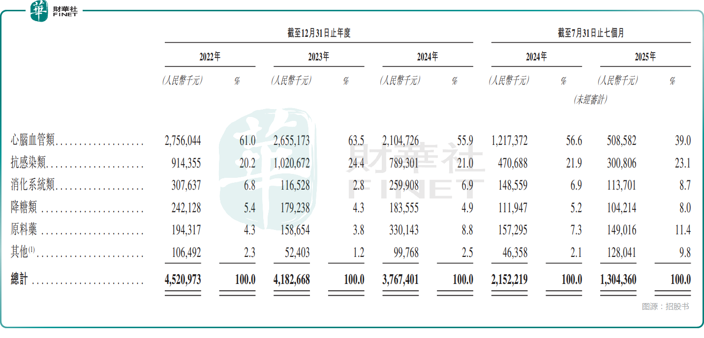 事实上,分领域来看,心脑血管类的收入近年出现大幅下降,2022年时的收入为27.56亿元,占收入比重为61.0%,2025年前7个月降至5.09亿元,占收入比重为39.0%。而悦康通®就是心脑血管类中的核心产品。