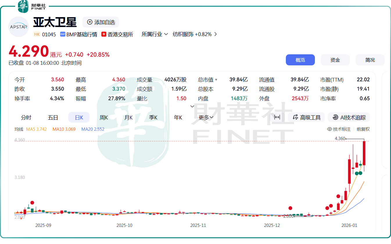 1月8日,亚太卫星(01045.HK)股价再度强势拉升,盘中一度触及4.36港元,创2016年以来新高;截至收盘,该股涨幅达20.85%,报4.29港元/股。