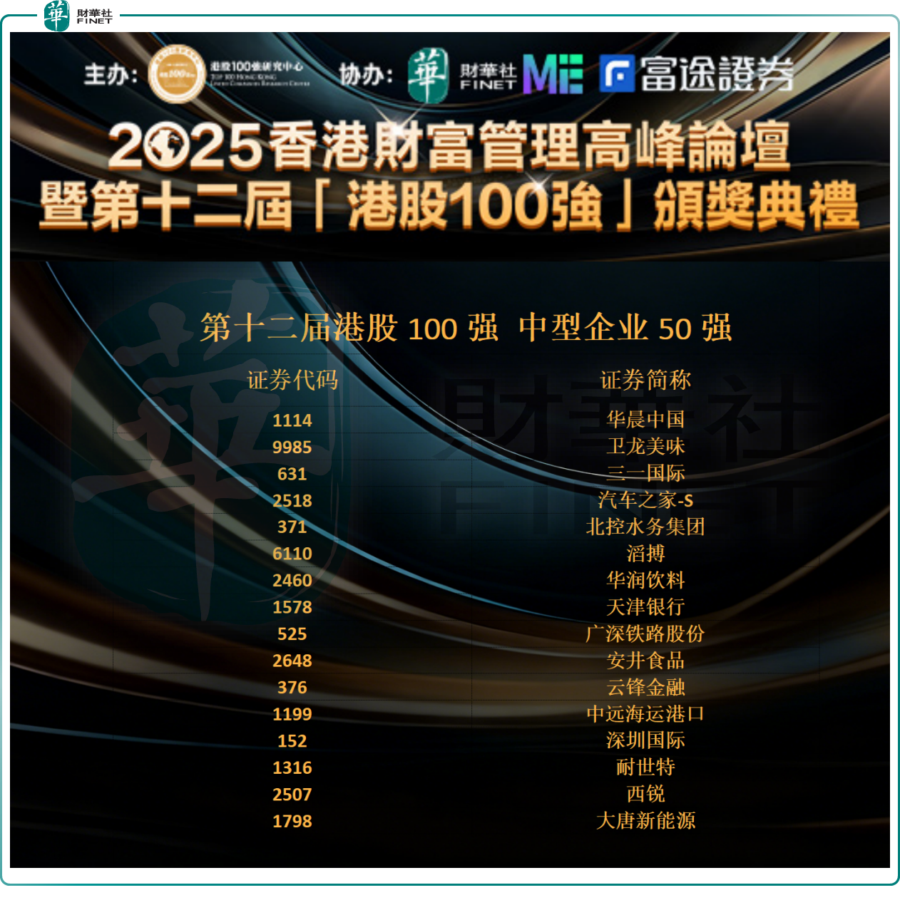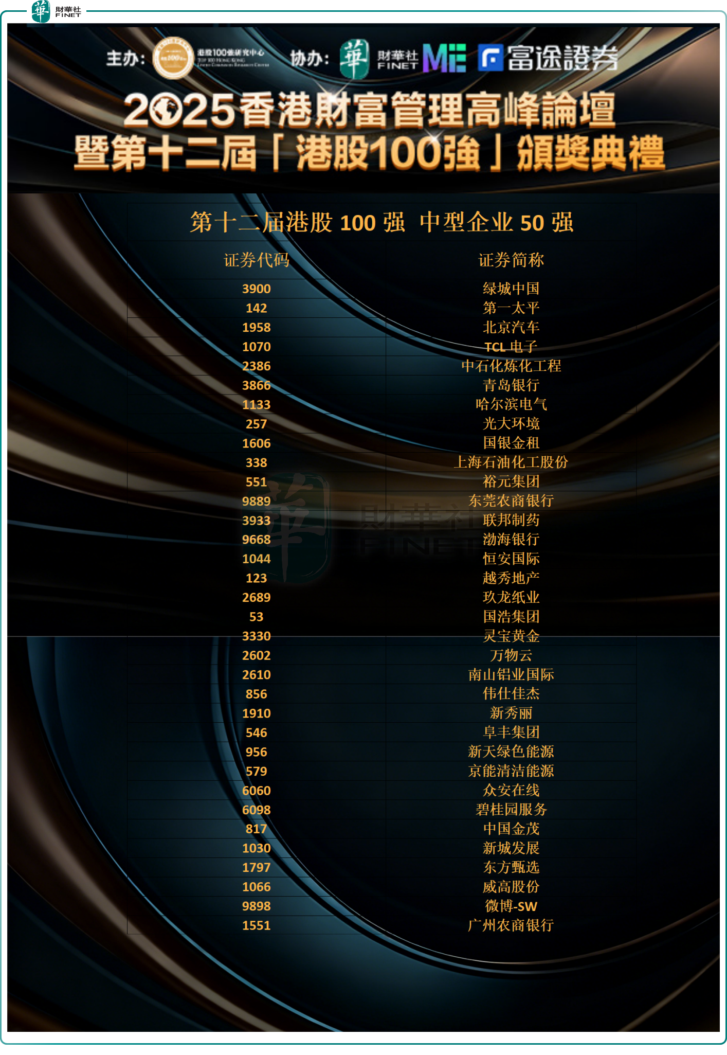 以下是第十二届港股100强“中型企业50强”榜单获奖企业名单(50名):