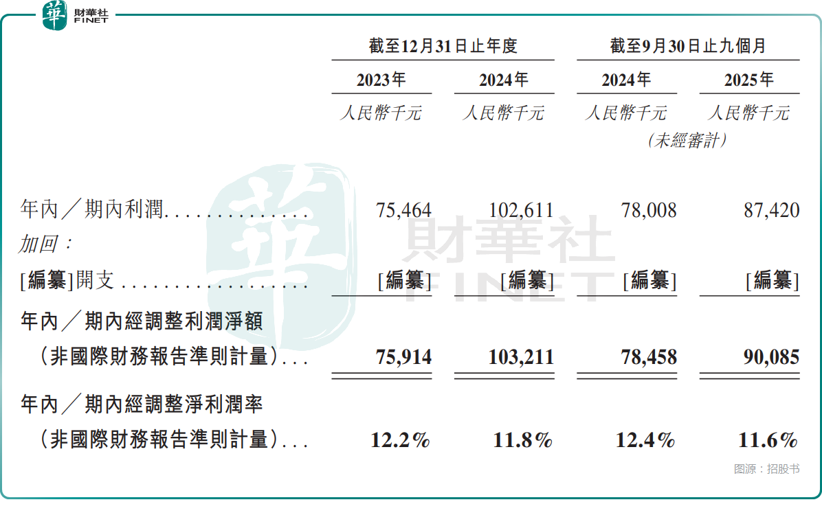 利润端,2023年、2024年及2025年前三季度的经调整利润净额(非国际财务报告准则计量)分别为7591.4万元、1.03亿元、9008.5万元,也处于增长状态;期内的经调整净利率则分别为12.2%、11.8%、11.6%,出现下滑。