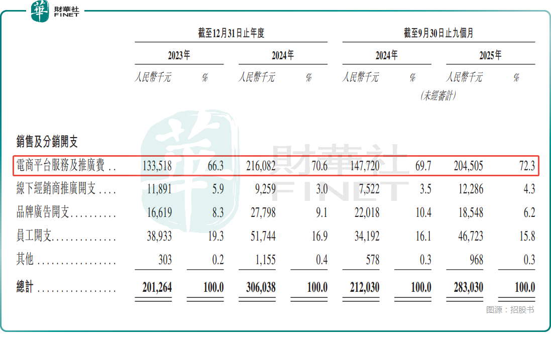 数据显示,2023年、2024年及2025年前三季度,公司的销售及分销开支分别为2.01亿元、3.06亿元、2.83亿元,占收入比例从32.3%攀升至35.0%,进一步增至36.3%。
