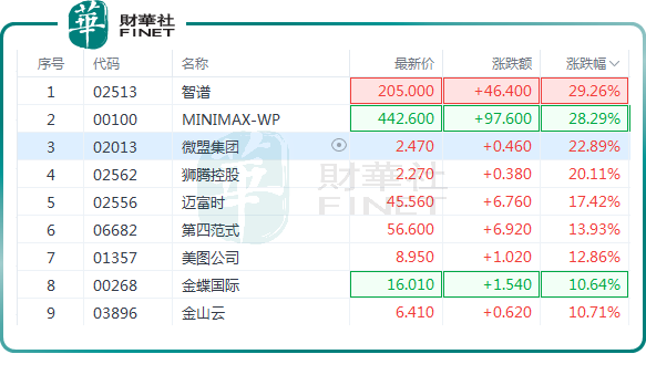 在港股,截至发稿前,次新股智谱(02513.HK)及MINIMAX-WP (00100.HK)涨幅均超28%。