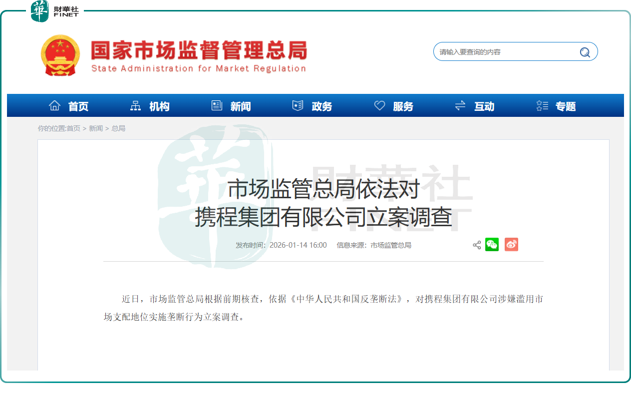 1月14日16点,国家市场监督管理总局发文指出,市场监管总局根据前期核查,依据《中华人民共和国反垄断法》,对携程集团涉嫌滥用市场支配地位实施垄断行为立案调查。
