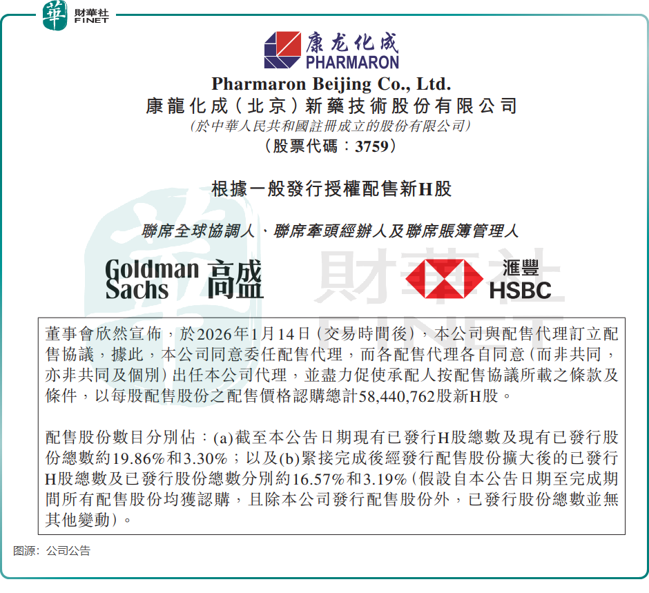 在这场资本盛宴中,CXO行业龙头康龙化成(300759.SZ)(03759.HK)于2026年1月15日正式加入战局,宣布启动自2019年港股上市以来的首次配股融资,以折让约8.5%的价格净筹13.19亿港元,引发市场广泛关注。