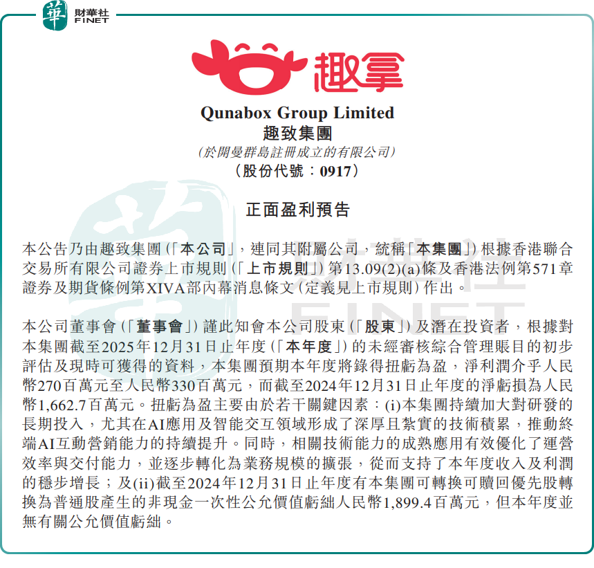 1月16日,趣致集团发布盈利公告显示,预期2025年将录得扭亏为盈,净利润介乎2.7亿元至3.3亿元(单位人民币,下同),而2024年则净亏损16.63亿元。