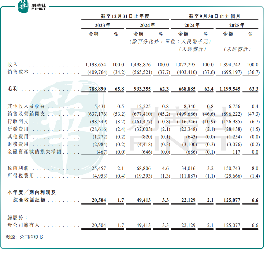 营销驱动下,公司业绩实现高速增长。2023年营收11.99亿元,2024年增至14.99亿元,2025年前9个月更是飙升至18.95亿元,同比增长76.7%;期内利润亦直线飙升,2025年前9个月进一步增至1.25亿元,上年同期仅2200余万元。