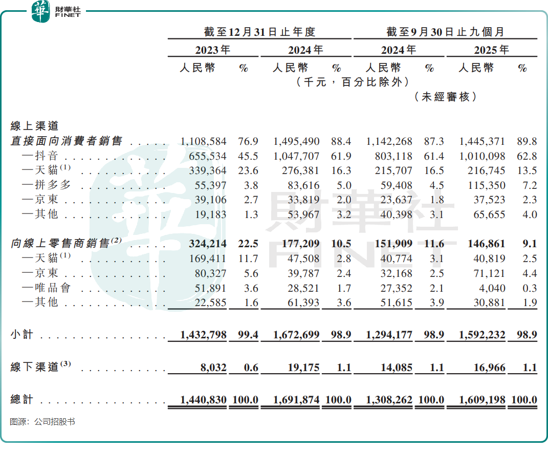 最突出的隐患是渠道上的“单腿走路”。接近99%的收入依赖线上直接销售,其中抖音一家独大,使公司的经营命脉与单一平台的生态深度绑定。在兴趣电商领域,平台规则、算法和流量成本的任何风吹草动,都可能对公司造成直接冲击。