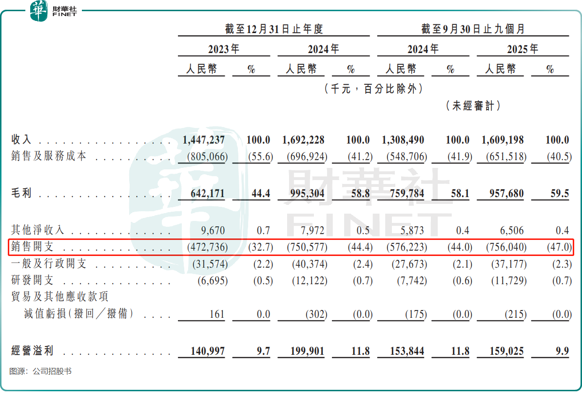“重营销、轻研发”的增长模式,同样面临可持续性的拷问。招股书显示,2025年前三季,公司的推广及技术服务开支接近6.7亿元,而同期研发费用仅1172.9万元,占营收比重低至0.7%,远低于康比特(833429.BJ)等同行的研发投入水平。这种策略短期可依靠流量快速起量,但长期缺乏核心技术支撑的产品极易陷入同质化红海。