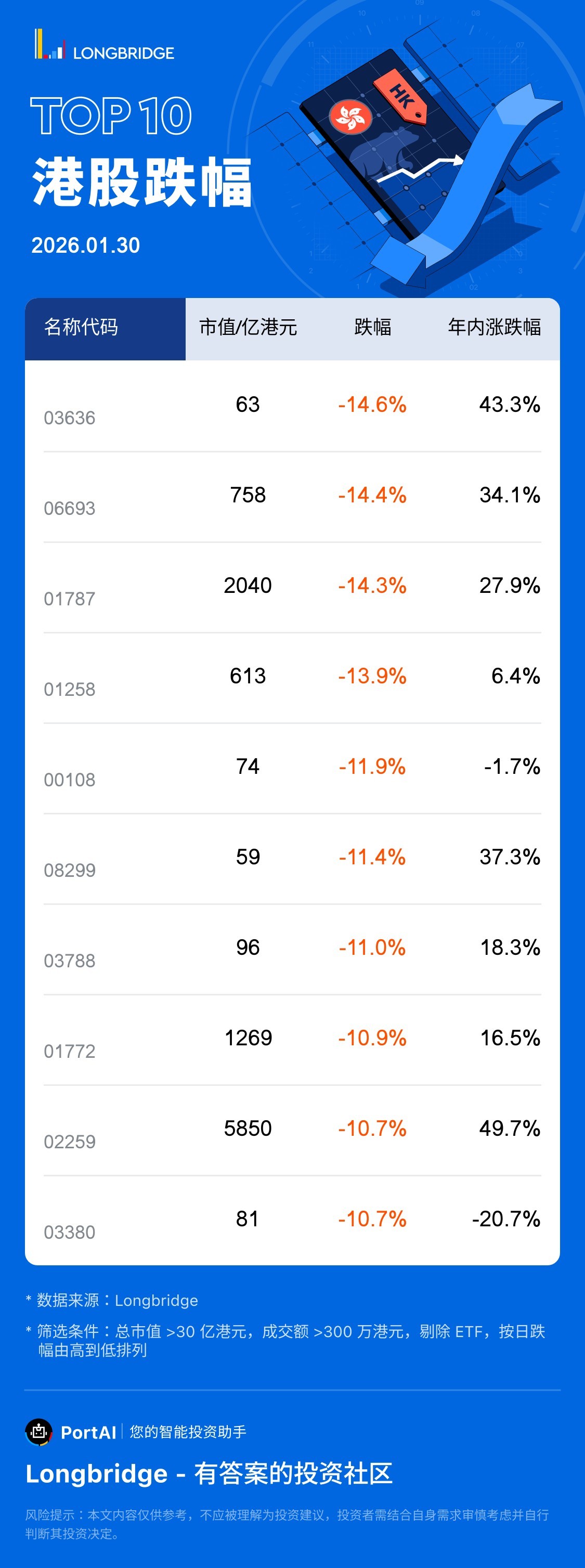 金浔资源 (03636) 跌 14.55%,成交额 7527.1 万港元,年内累计涨 43.3%。