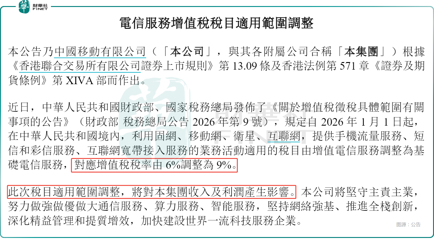 2月1日晚间,中国移动、中国电信、中国联通均在沪港两地交易所同步发布公告,明确根据财政部、国家税务总局联合发布的《关于增值税征税具体范围有关事项的公告》(财政部税务总局公告2026年第9号),自2026年1月1日起,国内利用固网、移动网、卫星、互联网提供的手机流量服务、短信和彩信服务、互联网宽带接入服务的业务活动适用的税目将由“增值电信服务”调整为“基础电信服务”,对应增值税税率随之由6%上调至9%