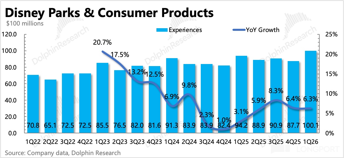 5. 主题公园抗住压力:顶住了基数走高和竞争逆风的拖累,靠着 “迪士尼宝藏号” 新游轮航线的带动,带动客流量增长 1%,人均消费额增加了 4%,整体收入增长 6.3%。