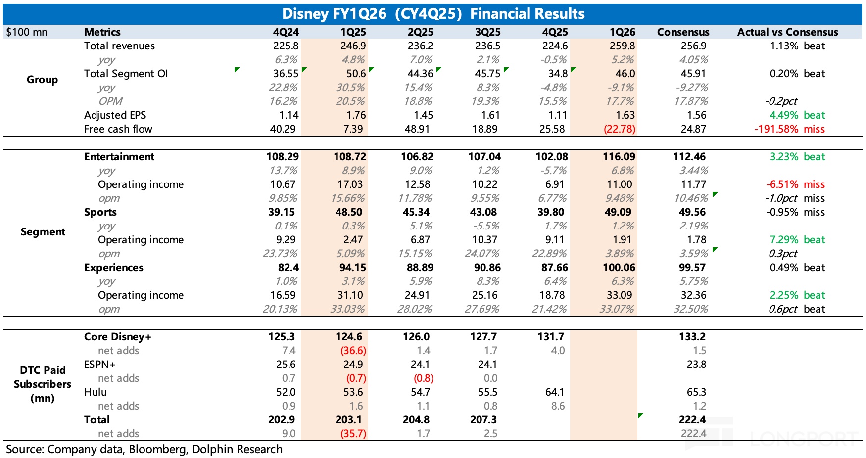 2. 指引同样无惊无喜:管理层对 Q2 的业绩指引,也和市场预期差不多,但公司提及公园业务的压力,国际游客减少导致美国本土的园区人流有影响。而对 2026 财年的指引,似乎仍然没有做明显调整。