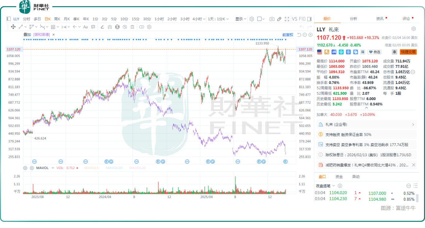 2月4日(美东时间),“减肥药双雄”股价走势再度分化:诺和诺德(NVO.US)延续此前跌势,跳空大挫6.18%;而礼来(LLY.US)则走出截然相反的行情,股价跳空飙升了10.33%,逼近历史高点,表现显著强于诺和诺德。