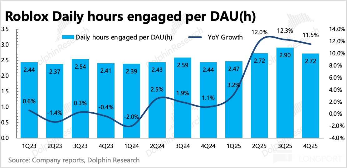 虽然爆款来的快去的也快(中小开发商的长期运营经验不足),但海豚君看到的是 Roblox 这个平台的粘性在提升——同时在线人数(CCU)占 DAU 比重一直在提高,哪怕在爆款降温的四季度,也同样的增加,这表明忠实用户似乎并未因为爆款热度下降或返校季而离开 Roblox。