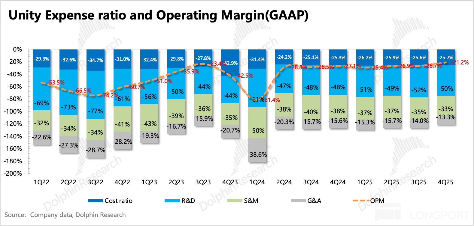 一般情况下,由于 Q4 是假日季,因此游戏行业在 Q1 会处于一个偏淡季的节奏,按 Unity 以往稳定情况下的变动幅度看,Q1 环比 Q4 会下降约 7%。因此如果预期 5% 的环比增速,加上季节效应的 7%,还原到 12% 的内生增速看,等于是相比预期 Q4 环比增速 10% 继续加速了。